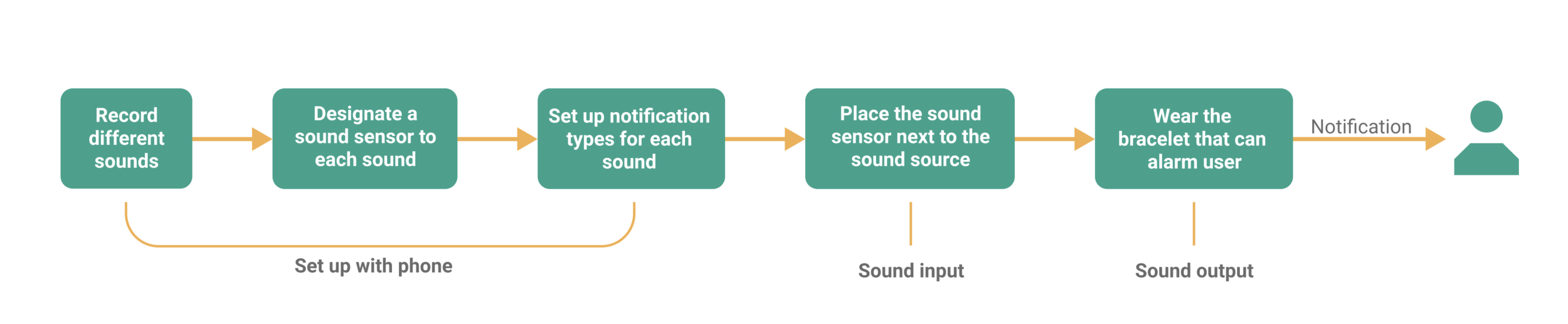 There are three steps for users. First, they need to use the phone to record the sounds they want to track. After all the desired sounds are recorded, they assign a sound sensor to each sound, then choose what type of notifications are preferred. Finally, they place the sensor next to the sound source. Each sound sensor will detect the designated sound and send signals to the wearable device, which converts the signals into a notification to alert users.
