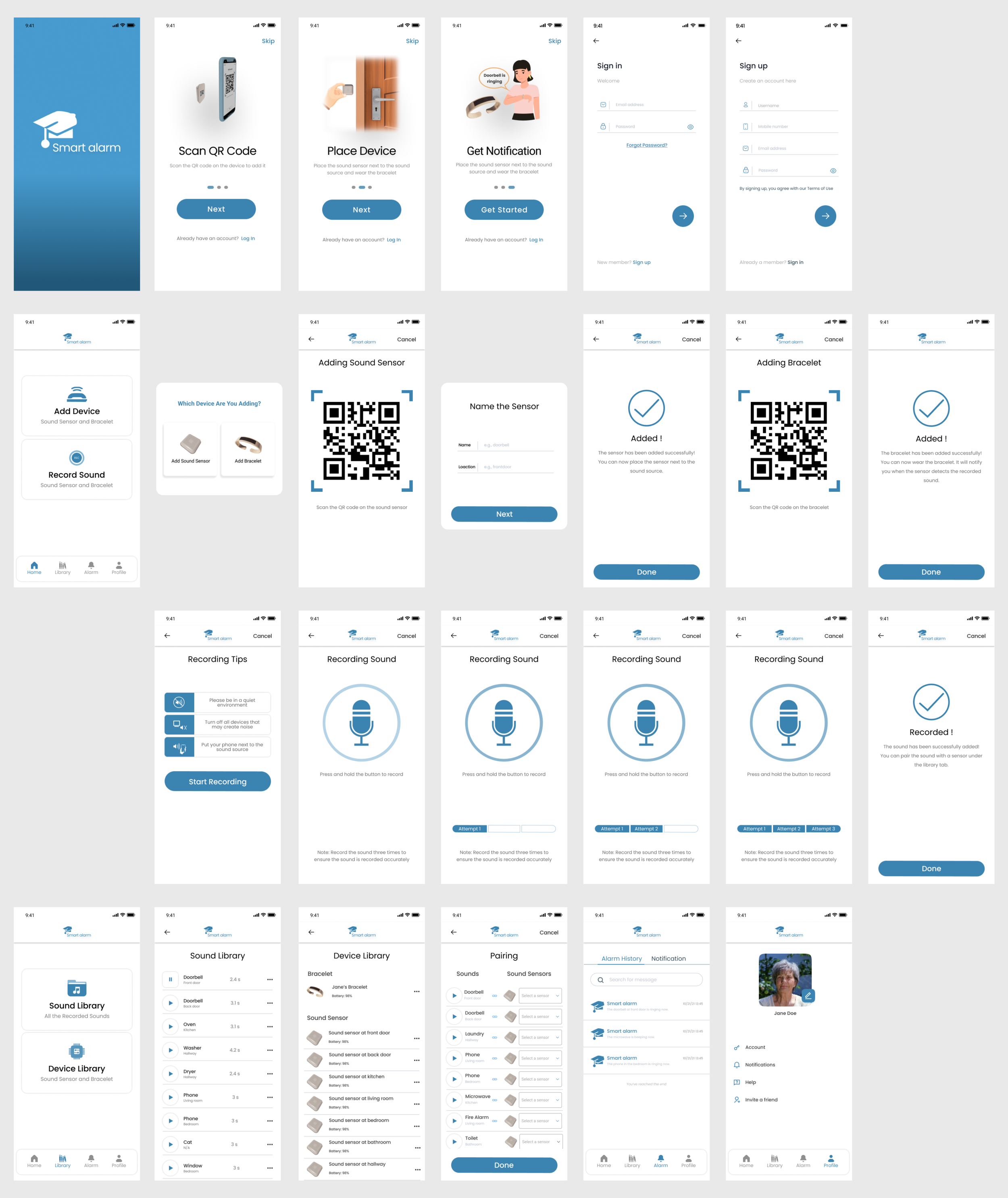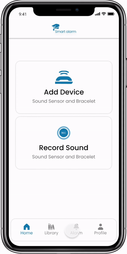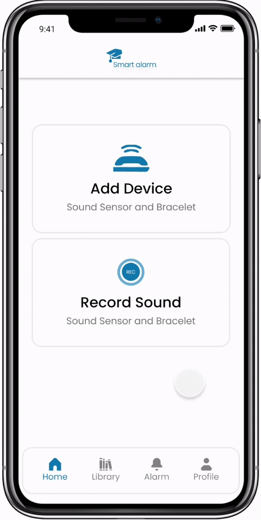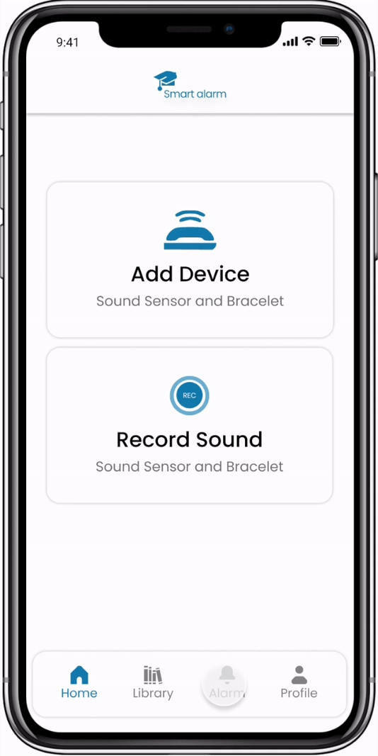 This alarm system has three parts: a sound sensor, a phone, and a wearable device. A user’s phone will play the role of a connector between the sound sensors and the wearable device. In this case, most of the settings will be done on the phone.