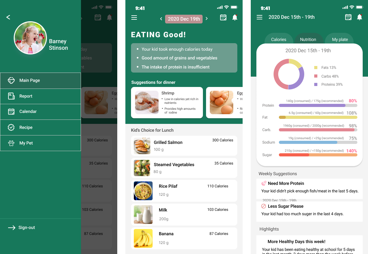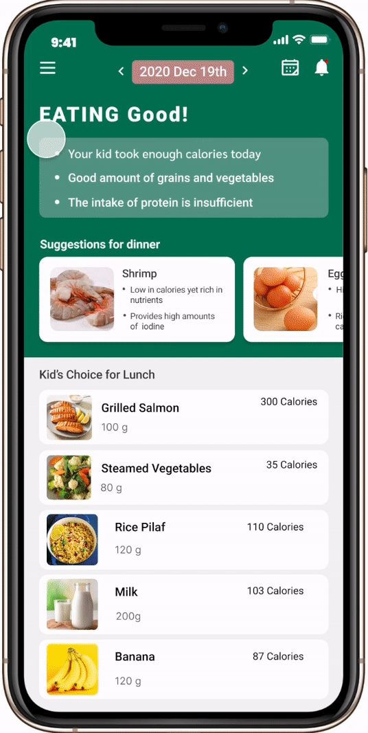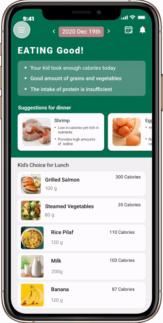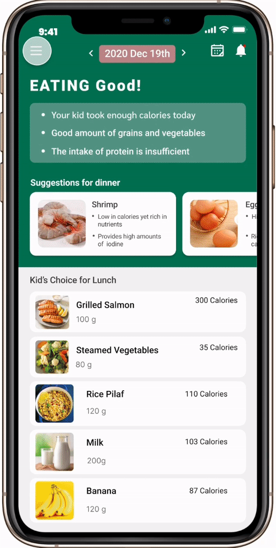 After children pick and eat their food at school, the app will generate a detailed report to let parents know how well their children ate. The main information will be what kind of food they ate and the nutrition contents.