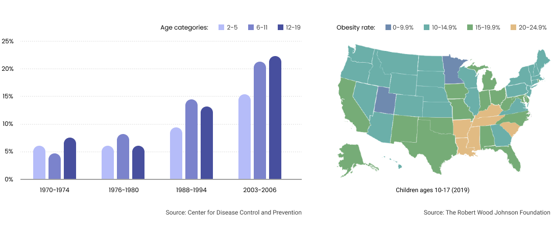 Being overweight or obese increases a child’s risk of poor physical health and is a risk factor for illness and mortality in adulthood. This issue generally results from a sustained energy imbalance, where the amount of energy a child consumes through eating and drinking outweighs the energy they expend through physical activity and bodily functions. Child obesity has become a serious issue since the ’70s. The percentage of children who are obese has been increasing at a high rate. After conducting research, I gathered these key findings: