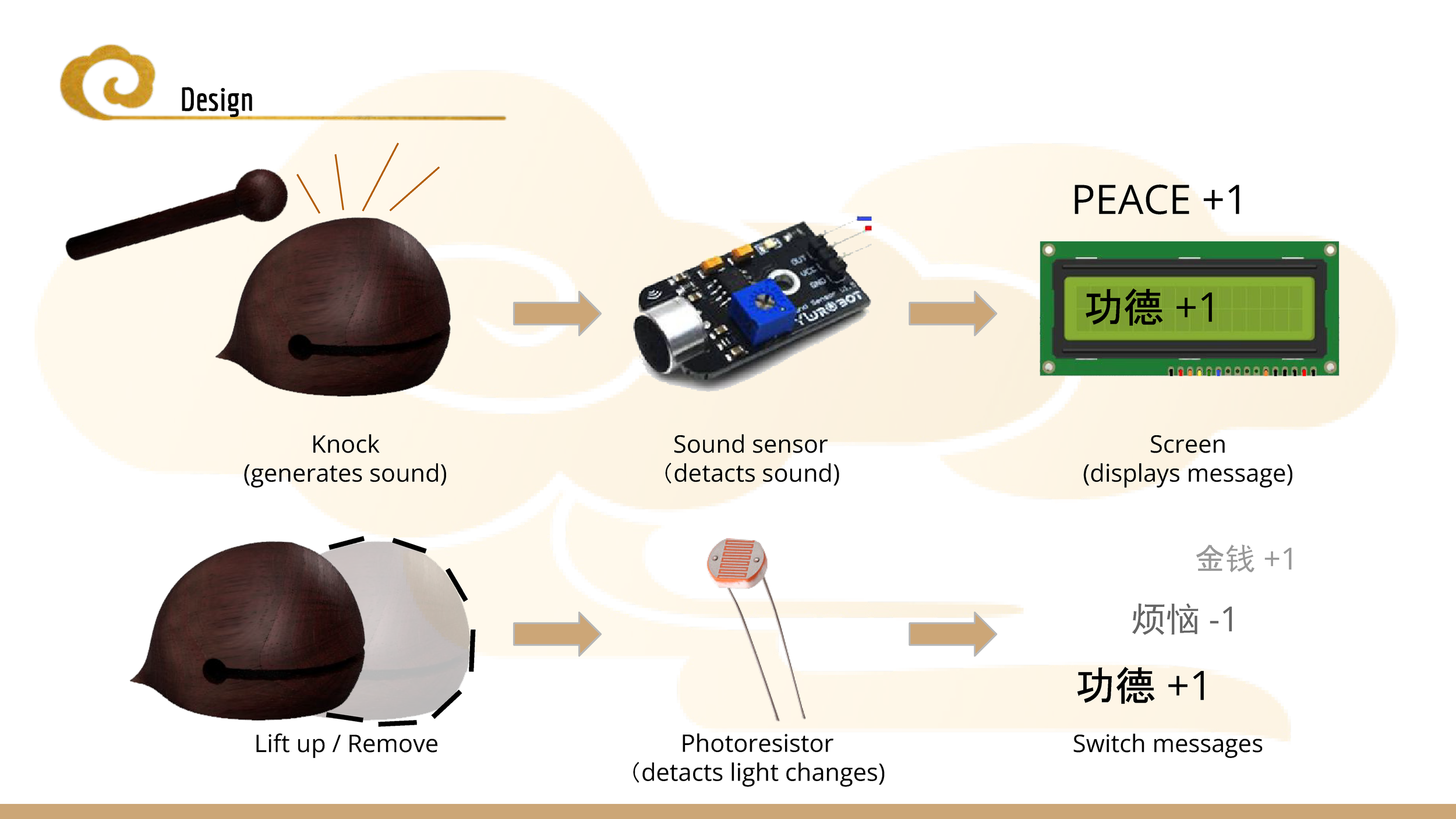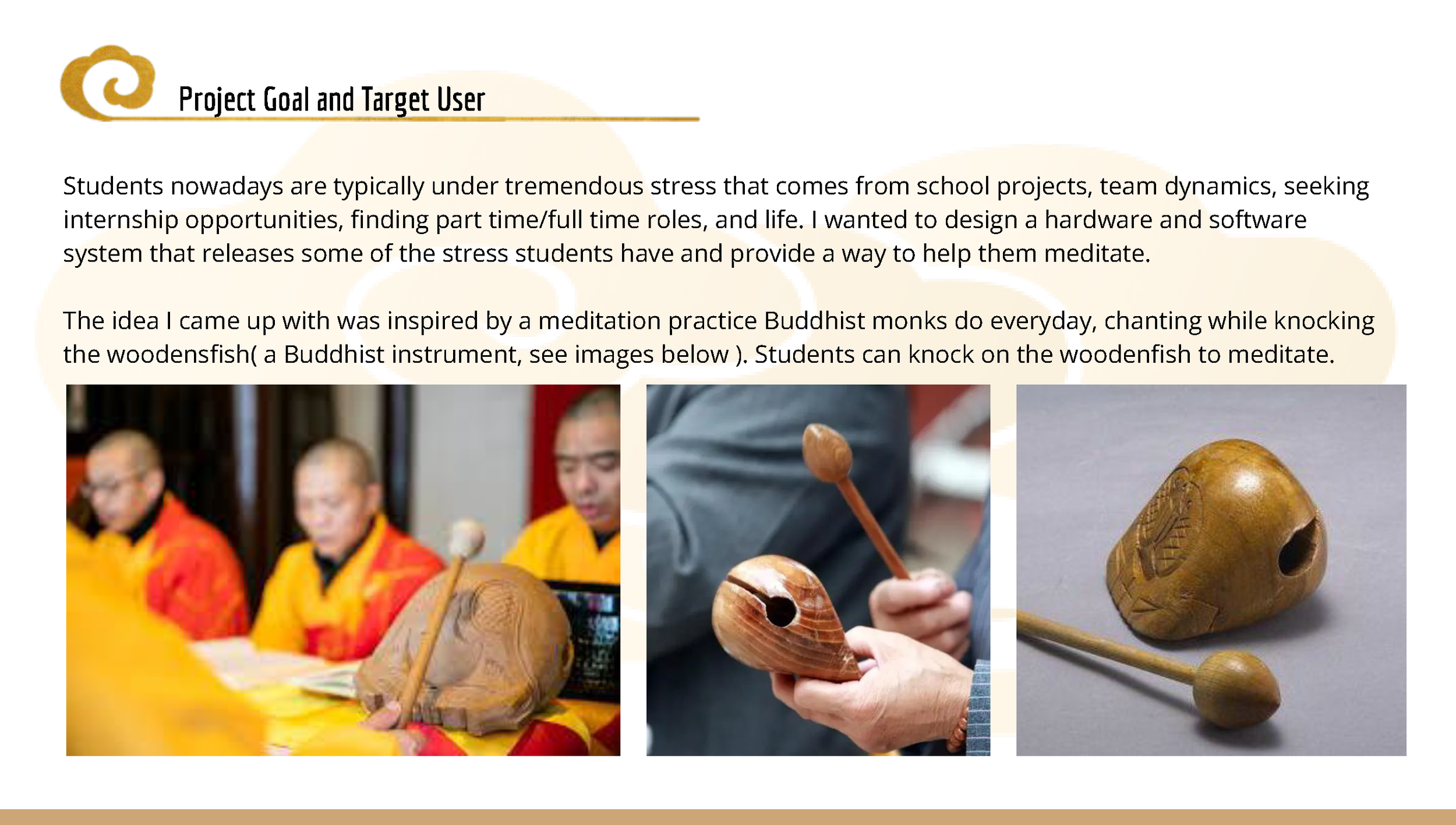 The direct translation from Chinese to English for the words Moyu is “touching the fish”, which means to slack. But in this case, I named it Moyu primarily because my design ended up looking like a small whale laying on a platform with a big smile. The other reason was that I wanted to encourage students who are under tremendous stress to take a break, to slack a little bit, and to meditate.