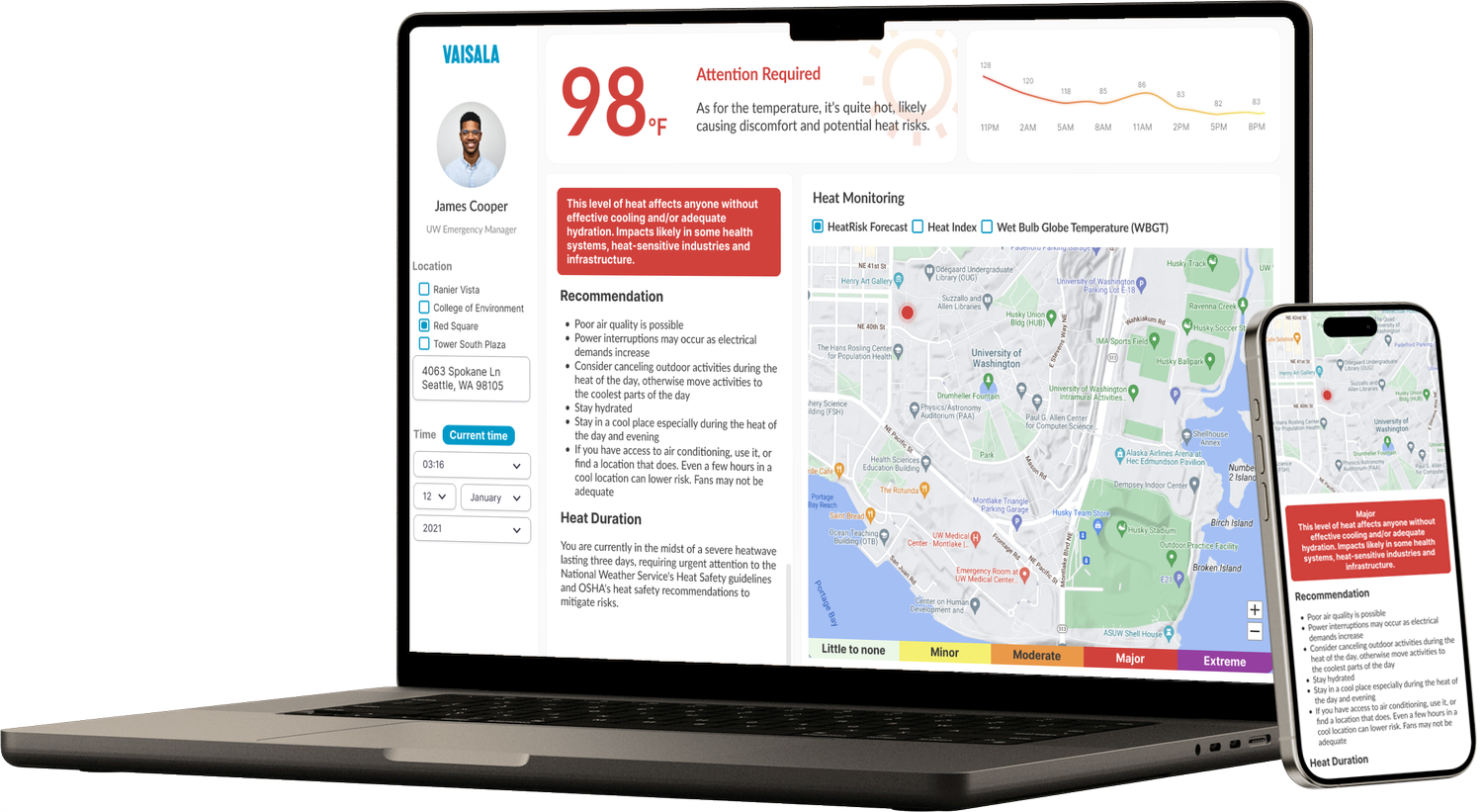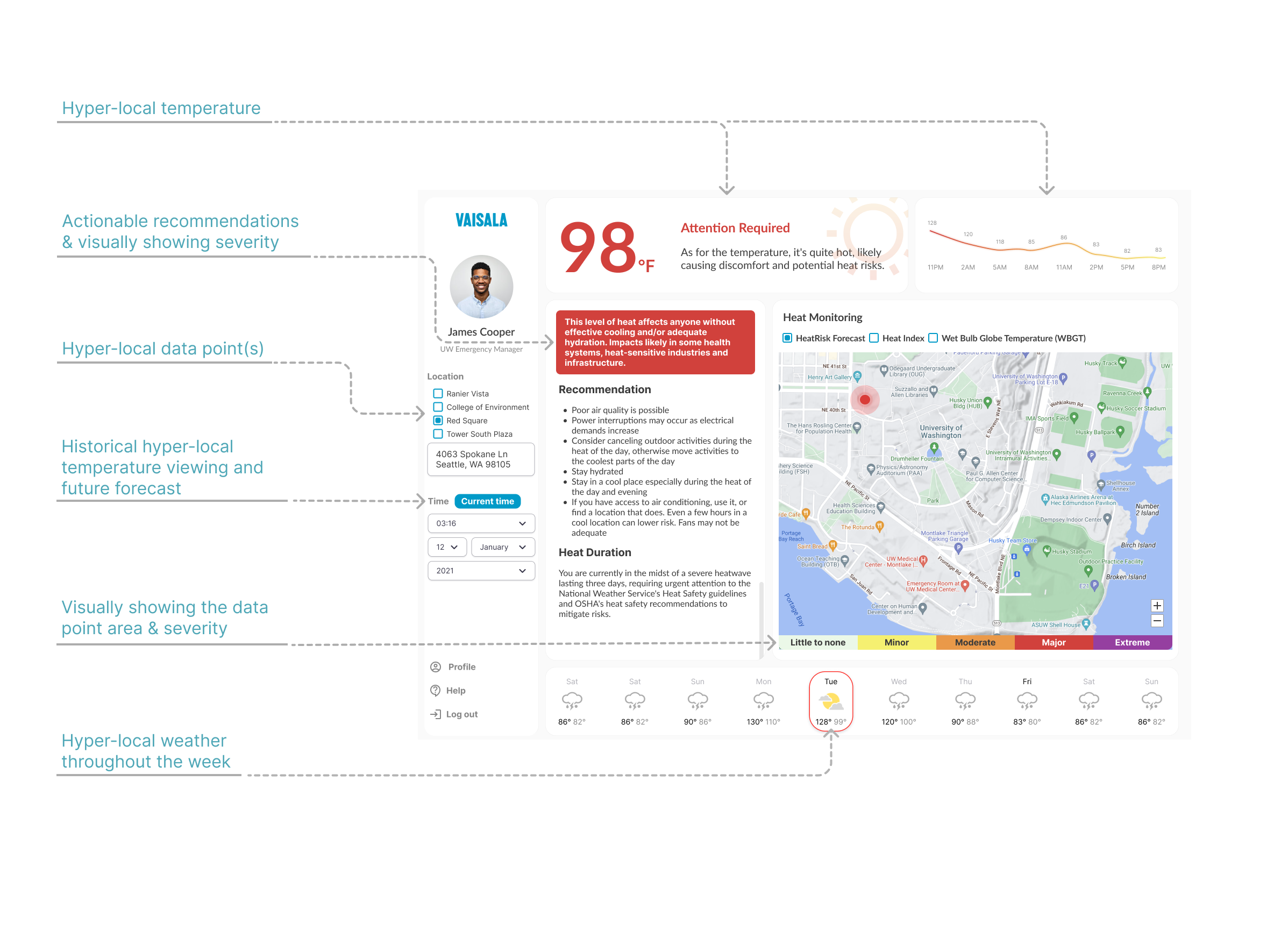 An intuitive dashboard that provides accurate hyper-local temperature which enhances decision-making and insights for the University of Washington Emergency Management.