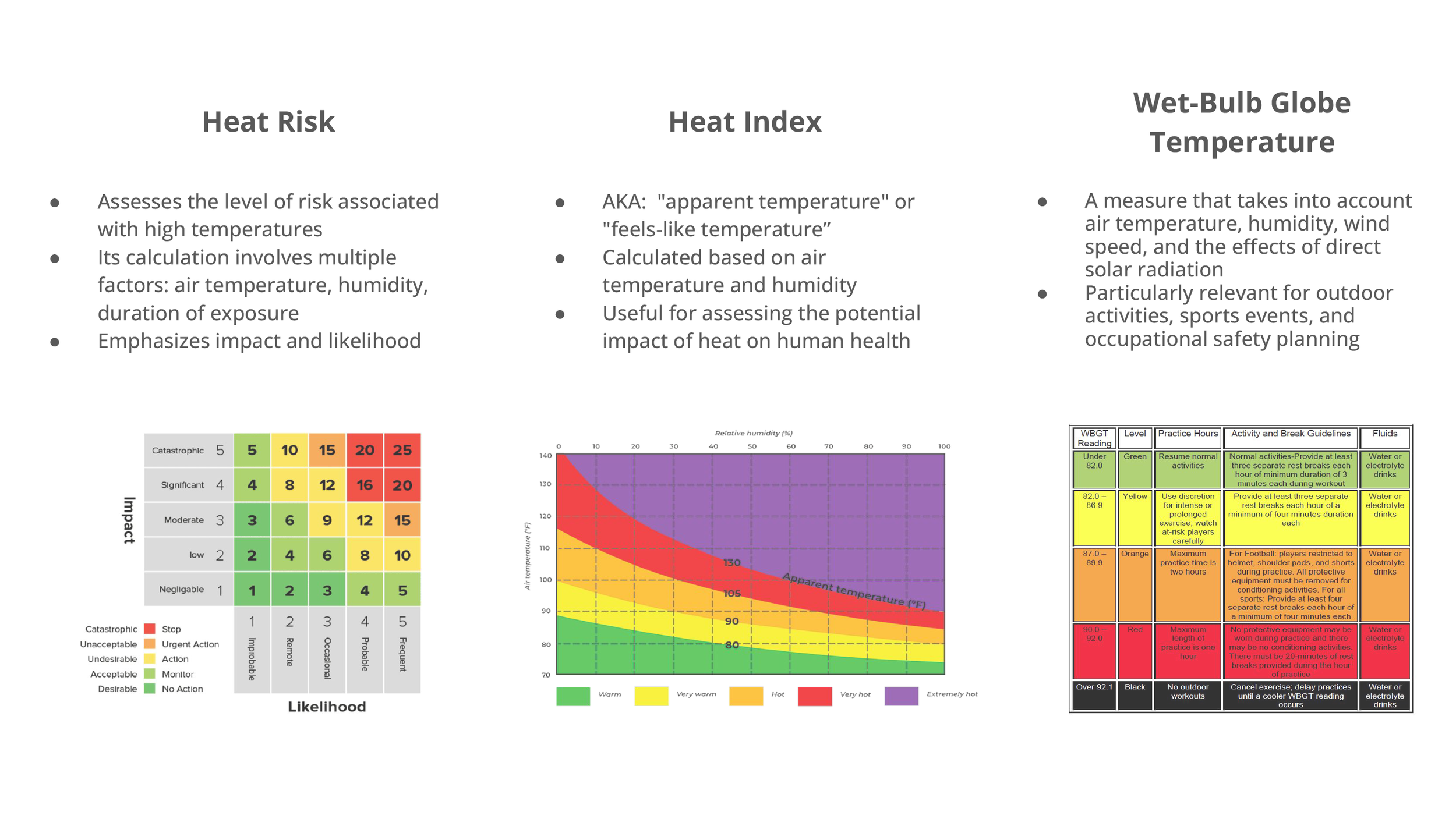 In addition to the four key findings mentioned above, decision-makers commonly use three methods to determine weather conditions: Heat Risk, Heat Index, and Wet-Bulb Globe Temperature.